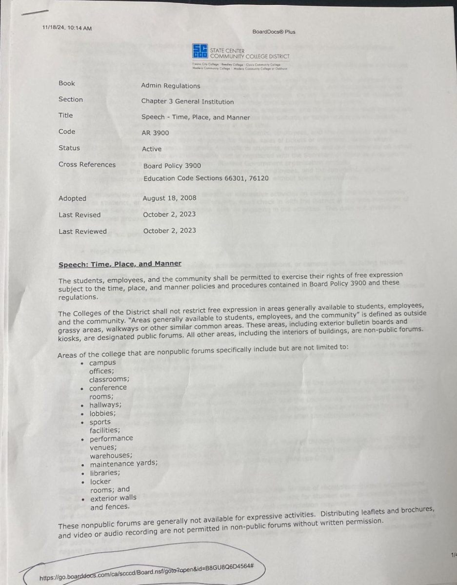 According to the SCCCD admin regulations book code AR 3900, as of Oct. 2, 2023, areas of Fresno City College that are non-public areas include but aren’t limited to: campus offices, classrooms, conference rooms, hallways, lobbies, sports facilities, performance venues, warehouses, maintenance yards, libraries, locker rooms and exterior walls and fences.