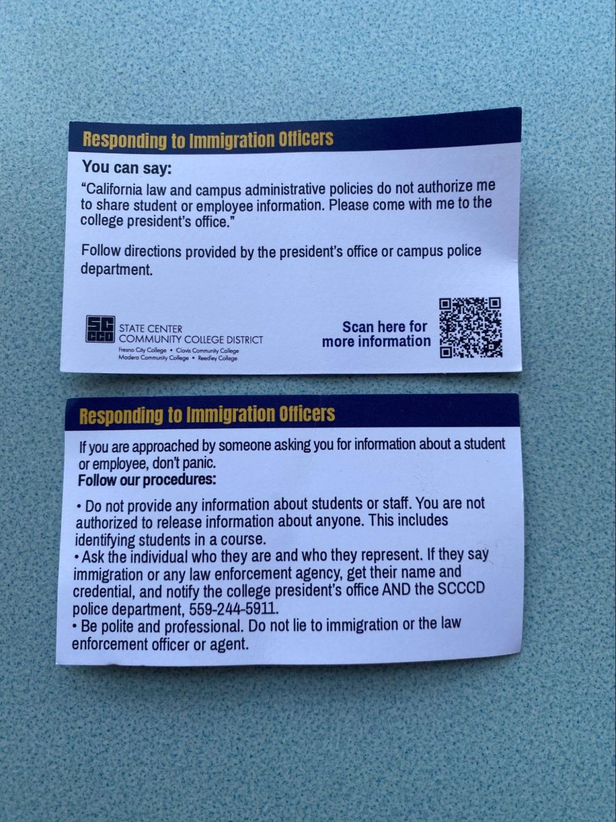 Attendees were told that if they see an ICE officer in a public area on campus, like grassy areas or the cafeteria, they are allowed to ask for that officer’s name and credentials. If they confirm that the person is an ICE officer, they are encouraged to escort them to the FCC president’s office in OAB-259 and call the emergency SCCCD police number, (559) 244-5911.