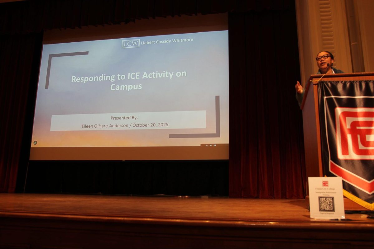 Fresno City College hosted a seminar to train campus employees to be prepared if Immigration and Customs Enforcement (ICE) agents come to campus. Eileen O’Hare-Anderson, an attorney with the Liebert Cassidy Whitmore law firm, led the training in the Old Administration Building’s auditorium for about 400 Fresno City College employees on Oct. 20.