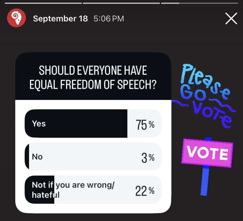 On Instagram, 75% (45 people) voted “Yes,” whereas only 22% (13 people) voted “Not if you are wrong or hateful.” On our website, the statistics are about the same, with 77% (10 people) voting “Yes” and 23% (3 people) voting “Not if you are wrong or hateful.” Most people seem to agree that the interest of fairness outweighs censorship.